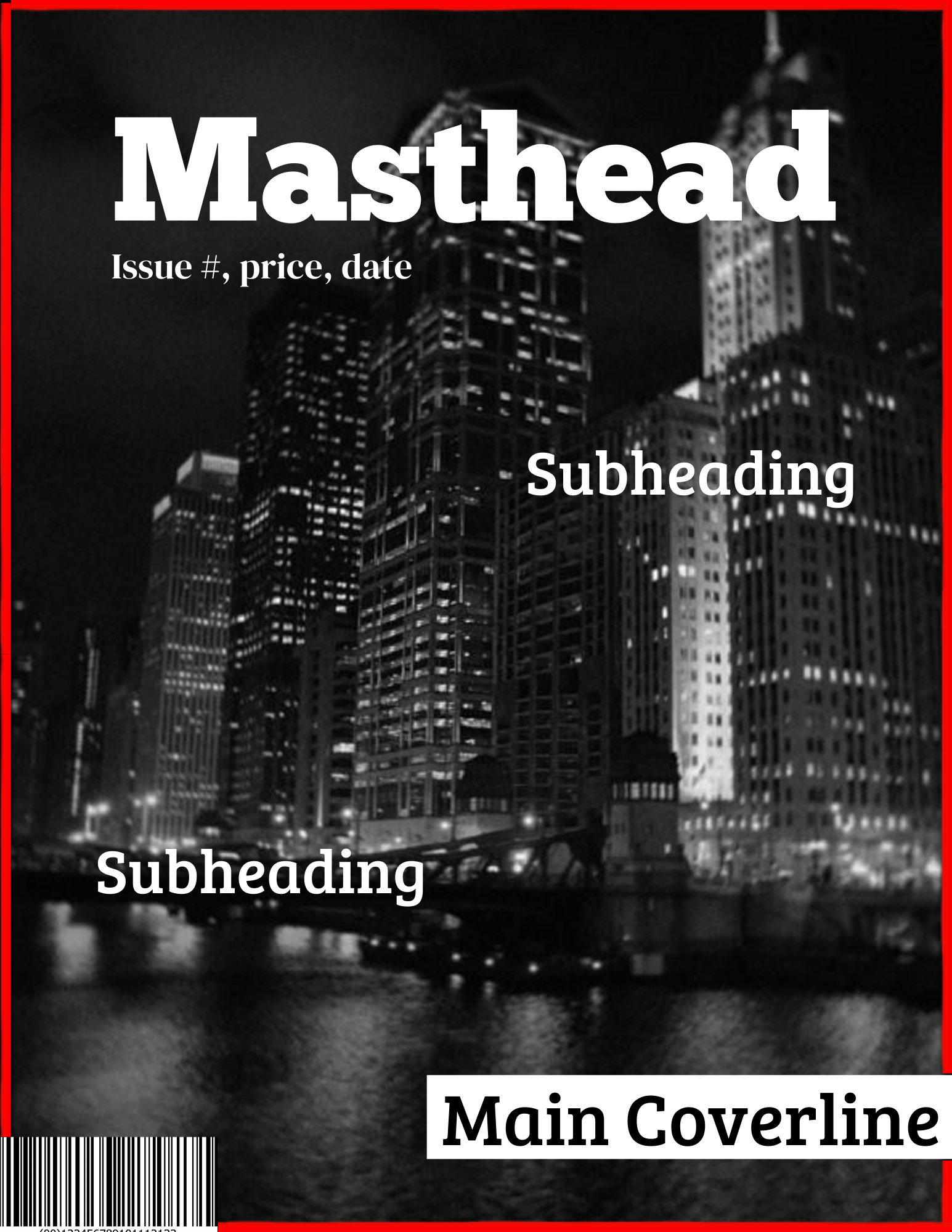 Theme & Miscellaneous. Factoring in all of this, the theme I tried to follow was similar subheadings, a distinct coverline and masthead, and keeping the miscellaneous information separate, all while trying to keep the colors red, white, and black. When talking about miscellaneous information, I put the issue number and date to keep track of the magazine. I put the price so that people know the price of the magazine when picking it up. The barcode at the bottom is just there to make organizing and sorting the magazine easier by a computer. All professional magazines have this, but it is not for design, just organizing and sorting the magazine.
